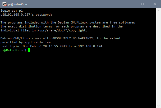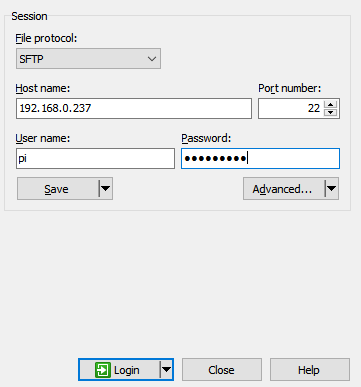 Connect to your Pi with the IP from earlier and the password you configured as such: