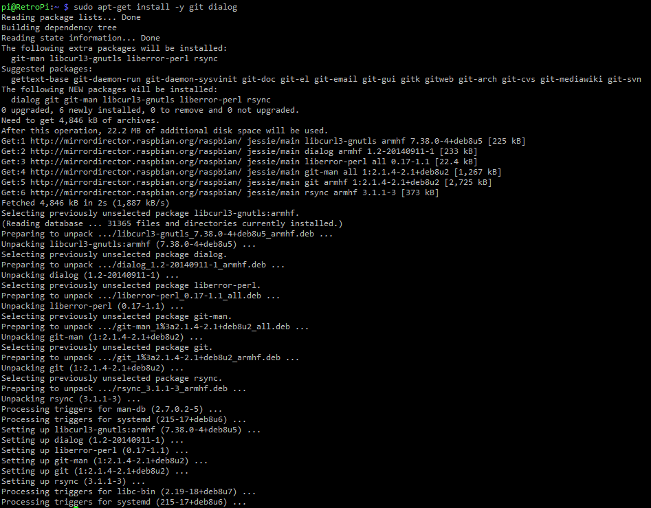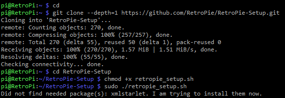cd git clone --depth=1 https://github.com/RetroPie/RetroPie-Setup.git cd RetroPie-Setup chmod +x retropie_setup.sh sudo ./retropie_setup.sh