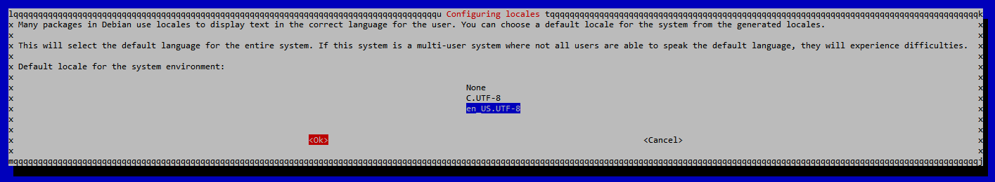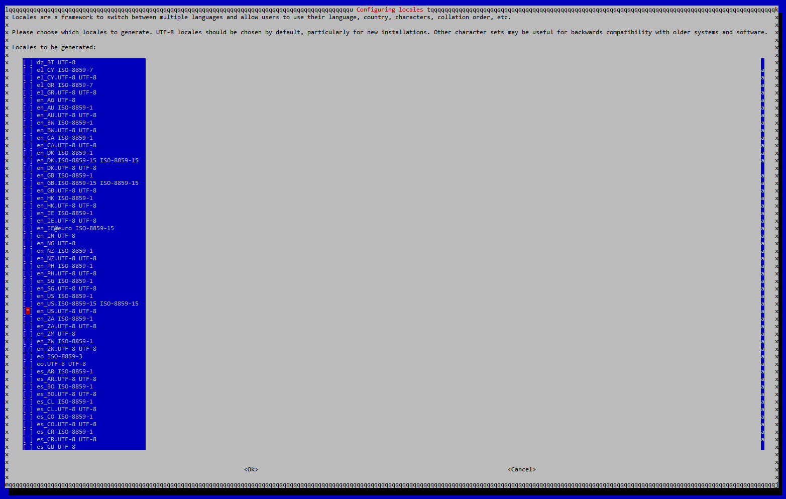 Select – 4 – Localisation Options > I1 – Change Locale > Deselect en_GB.UTF-8 UTF-8 and select en_US.UTF-8 UTF-8
