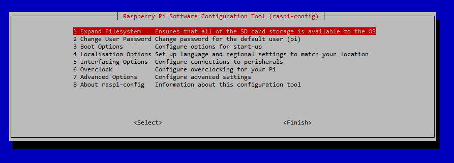 Select – 1 – Expand Filesystem, Hit [Enter] and proceed through the steps to get back to the selection screen: