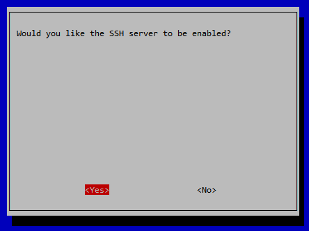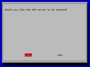 Select – 5 – Interfacing Options > P2 – SSH > Yes Enable SSH so we can access the Pi remotely: