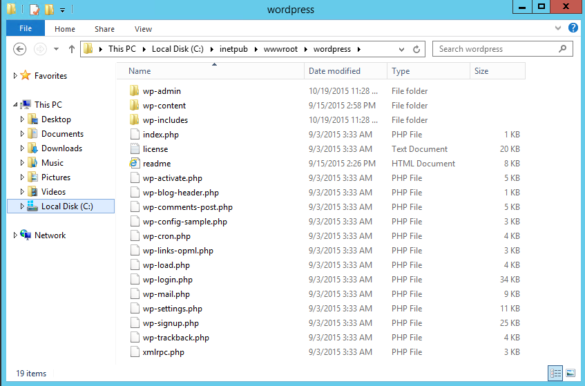 Download WordPress and unzip it to C:\inetpub\wwwroot, so you should see the following: