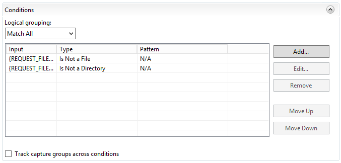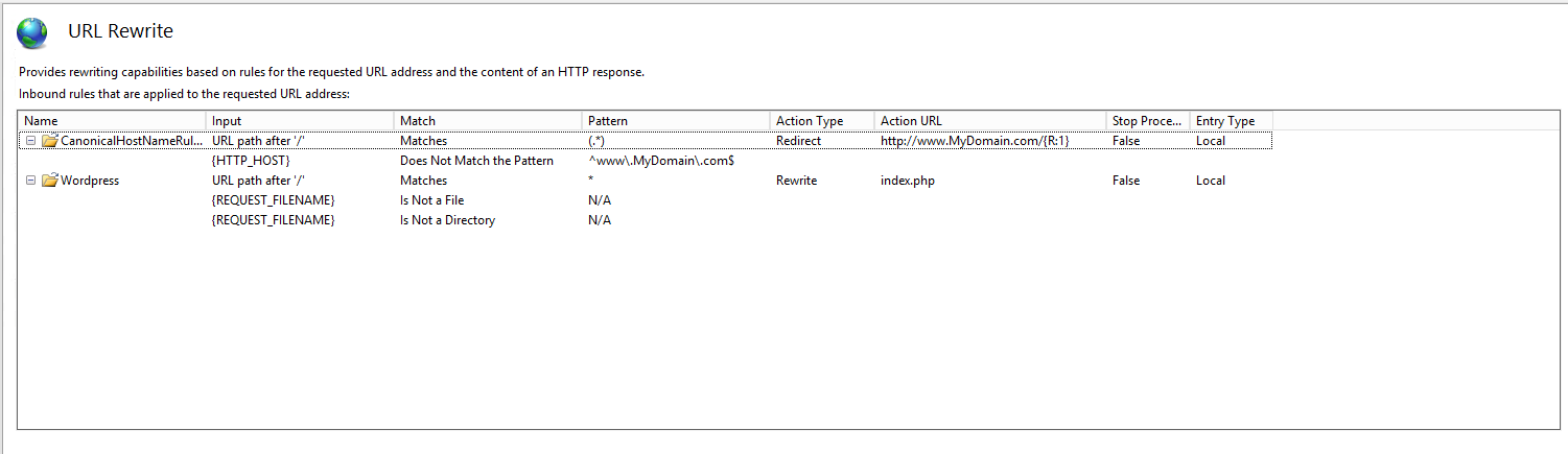 After both rules have been entered, your URL Rewrites should look similar to the following: