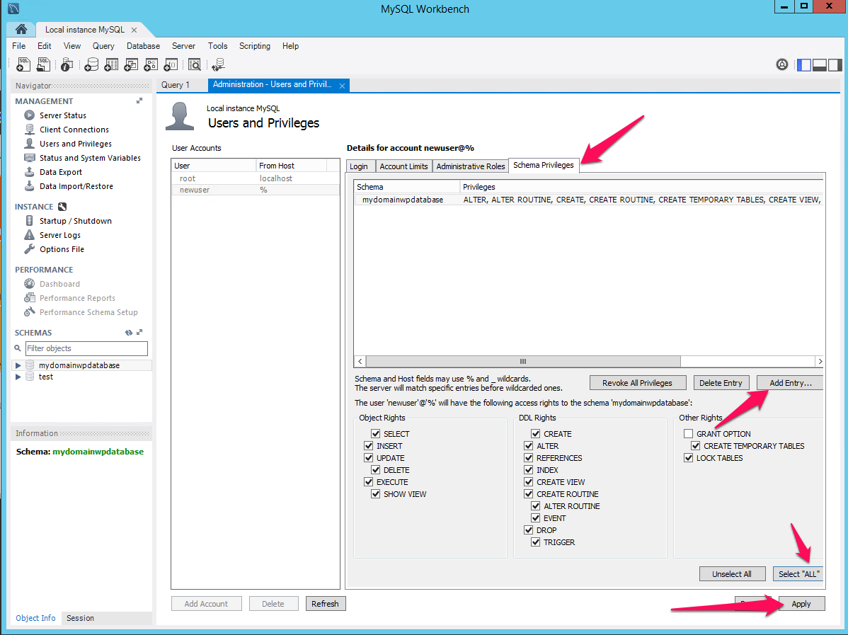Next, create a user for that database. I will use mydomainwpdbuser, and give that user full permissions to the Schema/DB that you just created. It will look similar to the following:
